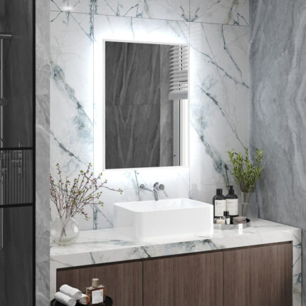 Прямоугольное настенное зеркало нового поколения с холодной подсветкой и антизапотеванием для ванной комнаты , изготовленное из зеркального полотна толщиной 4