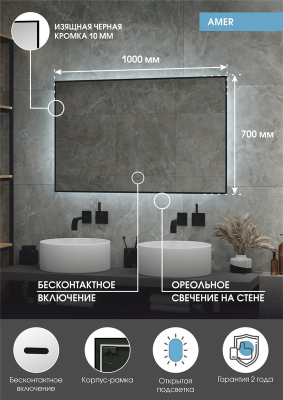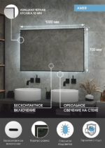 Зеркало с подсветкой Amer 1000х700 с бесконтактным сенсором, черной окантовкой и холодной подсветкой – это настенное зеркало нового поколения, изготовленное из полотна толщиной 4 мм. При изготовлении используется светодиодная лента с плотностью диодов 120 шт/м и мощностью 9,6 Вт/м, обеспечивающая яркое и равномерное свечение. Amer 1000х700 с бесконтактным сенсором и холодной подсветкой – это зеркало для ванной шириной 100 см, высотой 70 см. Вес зеркала с упаковкой – 10 кг. Для управления подсветкой используется бесконтактный cенсор. Температура ореольной подсветки холодная – 6000К, потребляемая мощность 30 Вт. Основа для изделия – корпус из МДФ-рамки. Срок гарантии – 2 года.