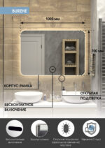 Зеркало с подсветкой “Burzhe Led” 1000х700 с бесконтактным сенсором, холодная подсветка – это настенное зеркало нового поколения, изготовленное из полотна толщиной 4 мм от ведущего европейского производителя AGC. При изготовлении используется светодиодная лента с плотностью диодов 120 шт/м и мощностью 9,6 Вт/м, обеспечивающая яркое и равномерное свечение. “Burzhe Led” 1000х700 с бесконтактным сенсором, холодная подсветка – это прямоугольное зеркало для ванной шириной 100 см, высотой 70 см. Вес зеркала с упаковкой – 8,8 кг. Для управления подсветкой используется бесконтактный cенсор. Температура ореольной подсветки холодная – 6000К, потребляемая мощность 31 Вт. Основа для изделия – корпус из ПВХ рамка белого цвета. Срок гарантии – 2 года.