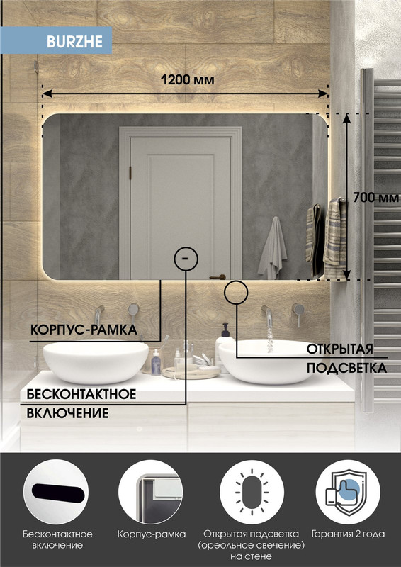 Зеркало с подсветкой “Burzhe Led” 1200х700 с бесконтактным сенсором, холодная подсветка – это настенное зеркало нового поколения, изготовленное из полотна толщиной 4 мм от ведущего европейского производителя AGC. При изготовлении используется светодиодная лента с плотностью диодов 120 шт/м и мощностью 9,6 Вт/м, обеспечивающая яркое и равномерное свечение. “Burzhe Led” 1200х700 с бесконтактным сенсором, холодная подсветка – это прямоугольное зеркало для ванной шириной 120 см, высотой 70 см. Вес зеркала с упаковкой – 10,5 кг. Для управления подсветкой используется бесконтактный cенсор. Температура ореольной подсветки холодная – 6000К, потребляемая мощность 35 Вт. Основа для изделия – корпус из ПВХ рамка белого цвета. Срок гарантии – 2 года.