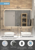 Настенное зеркало нового поколения для ванных комнат Burzhe с бесконтактным сенсором, холодной подсветкой и антизапотеванием, изготовленное из зеркального полотна толщиной 4 мм. При изготовлении используется светодиодная лента с плотностью диодов 120 шт/м и мощностью 9,6 Вт/м, обеспечивающая яркое и равномерное свечение. Основа для изделия – корпус из МДФ-рамки. Срок гарантии – 2 года.