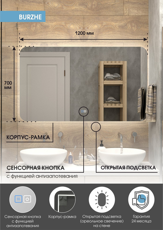 Continent Зеркало с подсветкой Burzhe 1200×700 открытая подсветка, антизапотевание