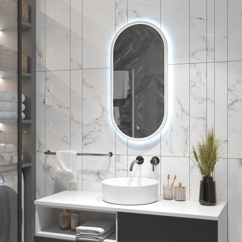 Зеркало с подсветкой Delia 400х800 в МДФ раме – это настенное зеркало нового поколения, изготовленное из полотна толщиной 4 мм. При изготовлении используется светодиодная лента с плотностью диодов 120 шт/м и мощностью 9,6 Вт/м, обеспечивающая яркое и равномерное свечение. Delia 400х800 в МДФ раме – это овальное зеркало для ванной шириной 40 см, высотой 80 см. Вес зеркала с упаковкой – 7,3 кг. Для управления подсветкой используется cенсор. Температура ореольной и внутренней подсветки холодная – 6000К, потребляемая мощность 26 Вт. Основа для изделия – корпус из МДФ в пленке. Срок гарантии – 2 года.