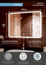 Зеркало с подсветкой “Demure Led” 800х600 – это настенное зеркало нового поколения, изготовленное из полотна толщиной 4 мм от ведущего европейского производителя AGC. При изготовлении используется светодиодная лента с плотностью диодов 120 шт/м и мощностью 9,6 Вт/м, обеспечивающая яркое и равномерное свечение. “Demure Led” 800х600 – это прямоугольное зеркало для ванной шириной 80 см, высотой 60 см. Вес зеркала с упаковкой – 7,2 кг. Для управления подсветкой используется cенсор. Температура внутренней подсветки холодная – 6000К, потребляемая мощность 25 Вт. Основа для изделия – корпус из ударопрочного пластика белого цвета. Срок гарантии – 2 года.