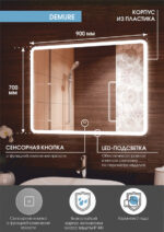 Зеркало с подсветкой “Demure Led” 900х700 – это настенное зеркало нового поколения, изготовленное из полотна толщиной 4 мм от ведущего европейского производителя AGC. При изготовлении используется светодиодная лента с плотностью диодов 120 шт/м и мощностью 9,6 Вт/м, обеспечивающая яркое и равномерное свечение. “Demure Led” 900х700 – это прямоугольное зеркало для ванной шириной 90 см, высотой 70 см. Вес зеркала с упаковкой – 8 кг. Для управления подсветкой используется cенсор. Температура внутренней подсветки холодная – 6000К, потребляемая мощность 29 Вт. Основа для изделия – корпус из ударопрочного пластика белого цвета. Срок гарантии – 2 года.