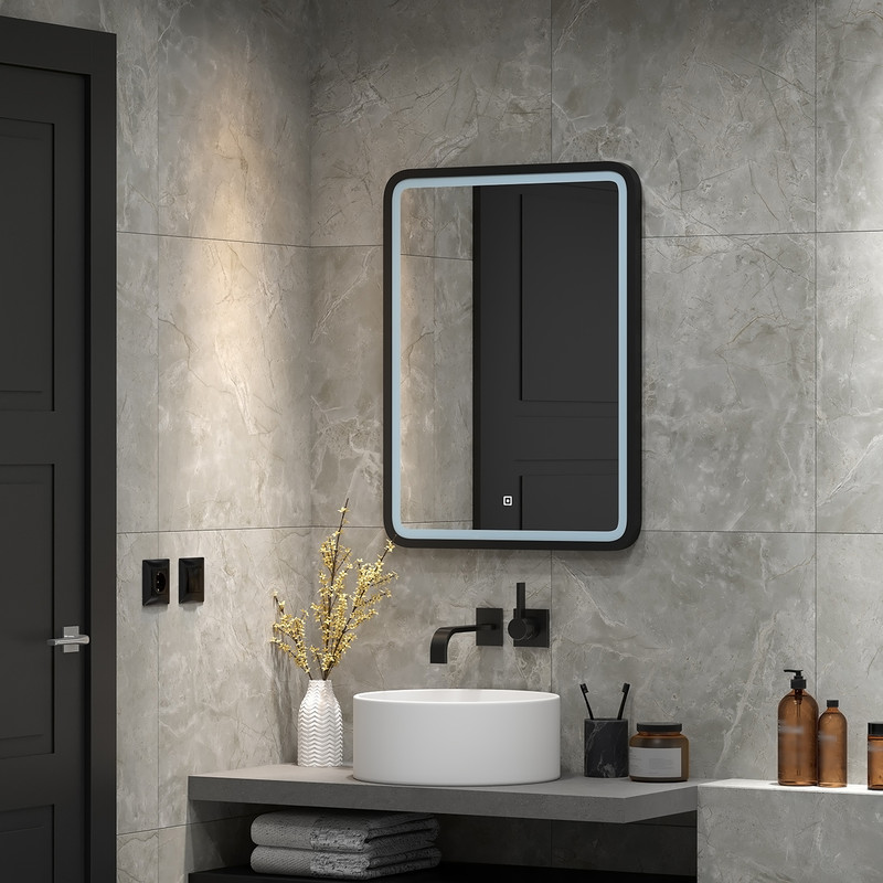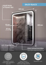 Зеркало с подсветкой “Enjoy Black Led” 600х800 – это настенное зеркало нового поколения, изготовленное из полотна толщиной 4 мм от ведущего европейского производителя AGC. При изготовлении используется светодиодная лента с плотностью диодов 120 шт/м и мощностью 9,6 Вт/м, обеспечивающая яркое и равномерное свечение. “Enjoy Black Led” 600х800 – это прямоугольное зеркало для ванной шириной 60 см, высотой 80 см. Вес зеркала с упаковкой – 7,8 кг. Для управления подсветкой используется cенсор. Температура внутренней подсветки холодная – 6000К, потребляемая мощность 25 Вт. Основа для изделия – корпус из МДФ в пленке черного цвета. Срок гарантии – 2 года.