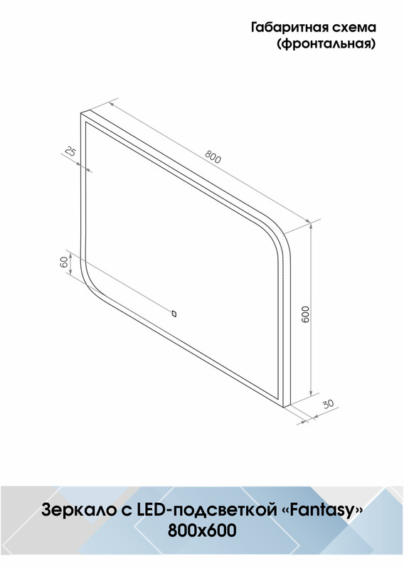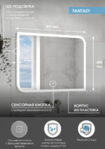 Зеркало с подсветкой “Fantasy Led” 800х600 – это настенное зеркало нового поколения, изготовленное из полотна толщиной 4 мм от ведущего европейского производителя AGC. При изготовлении используется светодиодная лента с плотностью диодов 120 шт/м и мощностью 9,6 Вт/м, обеспечивающая яркое и равномерное свечение. “Fantasy Led” 800х600 – это прямоугольное зеркало для ванной шириной 80 см, высотой 60 см. Вес зеркала с упаковкой – 7,2 кг. Для управления подсветкой используется cенсор. Температура внутренней подсветки холодная – 6000К, потребляемая мощность 25 Вт. Основа для изделия – корпус из ударопрочного пластика белого цвета. Срок гарантии – 2 года.