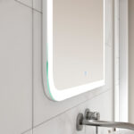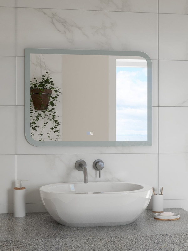 Прямоугольное настенное зеркало нового поколения с холодной подсветкой, часами и антизапотеванием для ванной комнаты, изготовленное из зеркального полотна толщиной 4 мм. При изготовлении используется светодиодная лента с плотностью диодов 120 шт/м и мощностью 9,6 Вт/м, обеспечивающая яркое и равномерное свечение. Температура внутренней подсветки – 6000К. Основа для изделия – корпус из ударопрочного пластика белого цвета. Срок гарантии – 2 года.