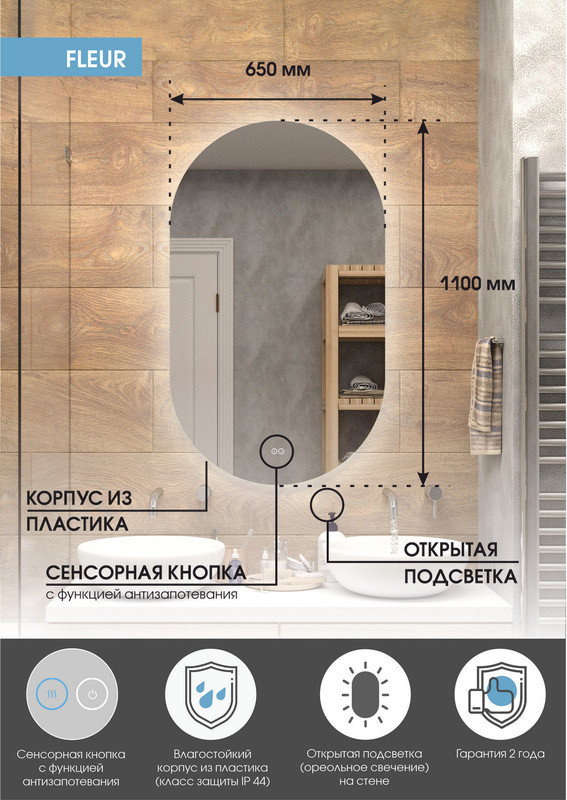Зеркало Fleur с бесконтактным сенсором, холодной подсветкой и антизапотеванием – это настенное зеркало нового поколения, изготовленное из полотна толщиной 4 мм. При изготовлении используется светодиодная лента с плотностью диодов 120 шт/м и мощностью 9,6 Вт/м, обеспечивающая яркое и равномерное свечение. Температура ореольной подсветки холодная – 6000К. Основа для изделия – корпус из ударопрочного пластика белого цвета. Срок гарантии – 2 года.