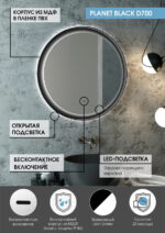 Зеркало с подсветкой “Planet Black Led” D 700 с бесконтактным сенсором – это настенное зеркало нового поколения, изготовленное из полотна толщиной 4 мм от ведущего европейского производителя AGC. При изготовлении используется светодиодная лента с плотностью диодов 120 шт/м и мощностью 9,6 Вт/м, обеспечивающая яркое и равномерное свечение. “Planet Black Led” D 700 с бесконтактным сенсором – это круглое зеркало для ванной шириной 70 см, высотой 70 см. Вес зеркала с упаковкой – 6 кг. Для управления подсветкой используется бесконтактный cенсор. Температура двойной подсветки холодная – 6000К, потребляемая мощность 25 Вт. Основа для изделия – корпус из МДФ в пленке черного цвета. Срок гарантии – 2 года.