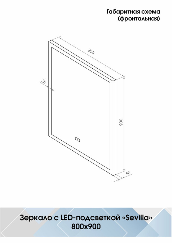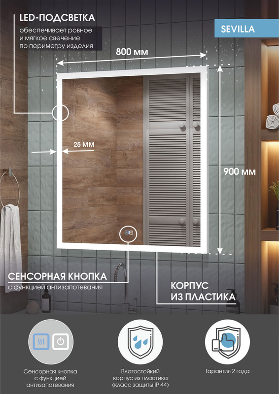 Зеркало с подсветкой и антизапотеванием Sevilla – это настенное зеркало нового поколения, изготовленное из полотна толщиной 4 мм. При изготовлении используется светодиодная лента с плотностью диодов 120 шт/м и мощностью 9,6 Вт/м, обеспечивающая яркое и равномерное свечение. Для управления подсветкой используется cенсор. Температура внутренней подсветки холодная – 6000К. Основа для изделия – корпус из ударопрочного пластика белого цвета. Срок гарантии – 2 года.
