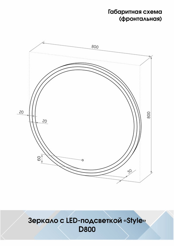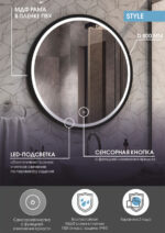 Зеркало с подсветкой “Style Black Led” D 800 – это настенное зеркало нового поколения, изготовленное из полотна толщиной 4 мм от ведущего европейского производителя AGC. При изготовлении используется светодиодная лента с плотностью диодов 120 шт/м и мощностью 9,6 Вт/м, обеспечивающая яркое и равномерное свечение. “Style Black Led” D 800 – это круглое зеркало для ванной шириной 80 см, высотой 80 см. Вес зеркала с упаковкой – кг. Для управления подсветкой используется cенсор. Температура внутренней подсветки холодная – 6000К, потребляемая мощность 29 Вт. Основа для изделия – корпус из МДФ в пленке черного цвета. Срок гарантии – 2 года.