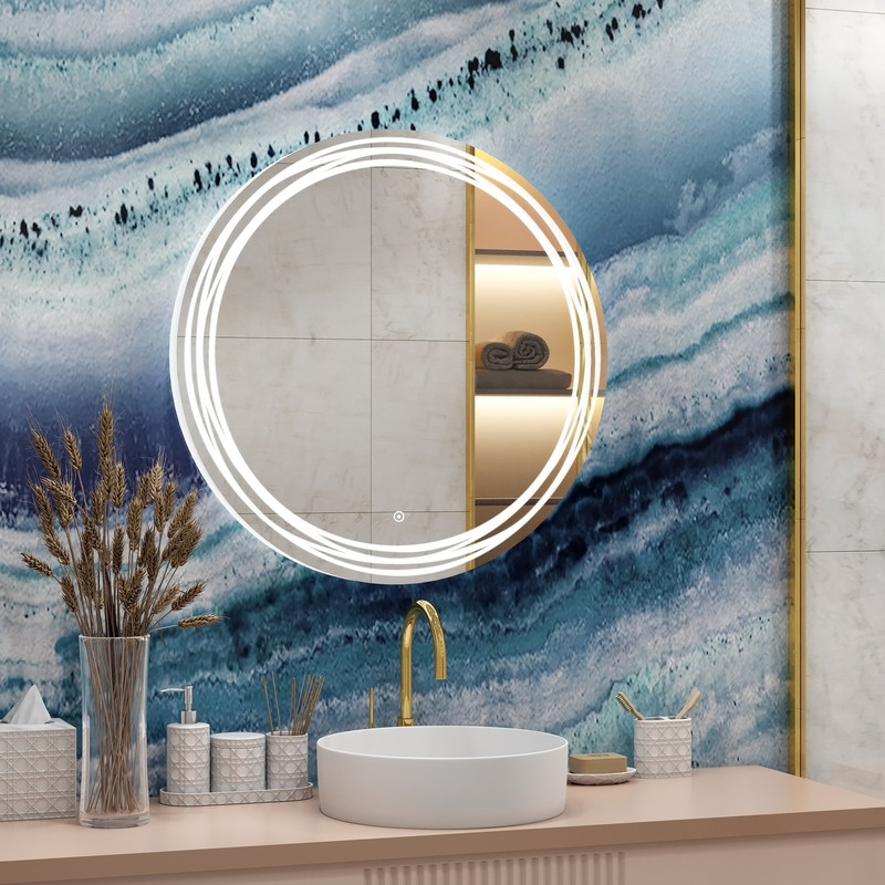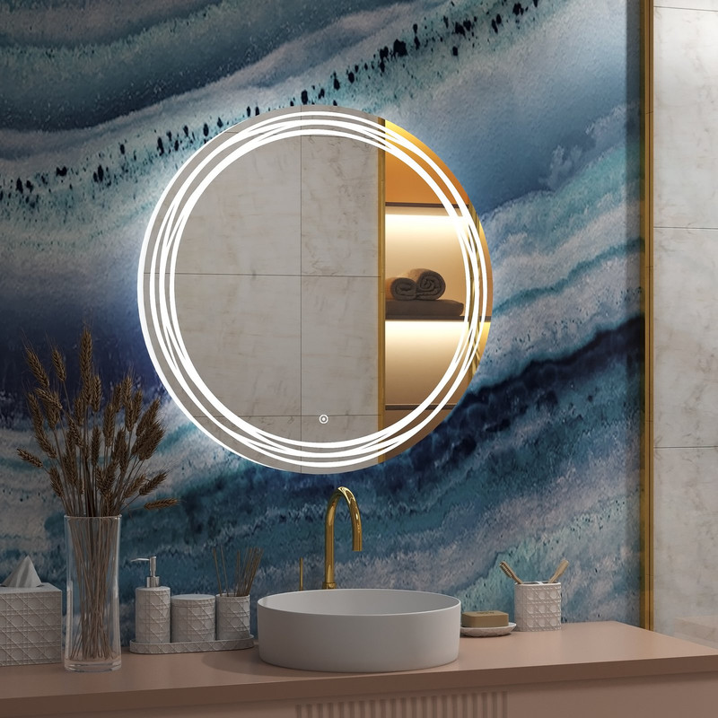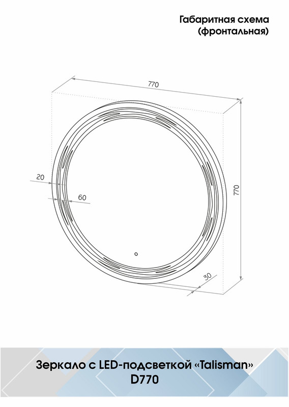 Зеркало с подсветкой “Talisman Led” d 770 – это настенное зеркало нового поколения, изготовленное из полотна толщиной 4 мм от ведущего европейского производителя AGC. При изготовлении используется светодиодная лента с плотностью диодов 120 шт/м и мощностью 9,6 Вт/м, обеспечивающая яркое и равномерное свечение. “Talisman Led” d 770 – это круглое зеркало для ванной шириной 77 см, высотой 77 см. Вес зеркала с упаковкой – 7,2 кг. Для управления подсветкой используется cенсор. Температура внутренней подсветки холодная – 6000К, потребляемая мощность 28 Вт. Основа для изделия – корпус из ударопрочного пластика белого цвета. Срок гарантии – 2 года.