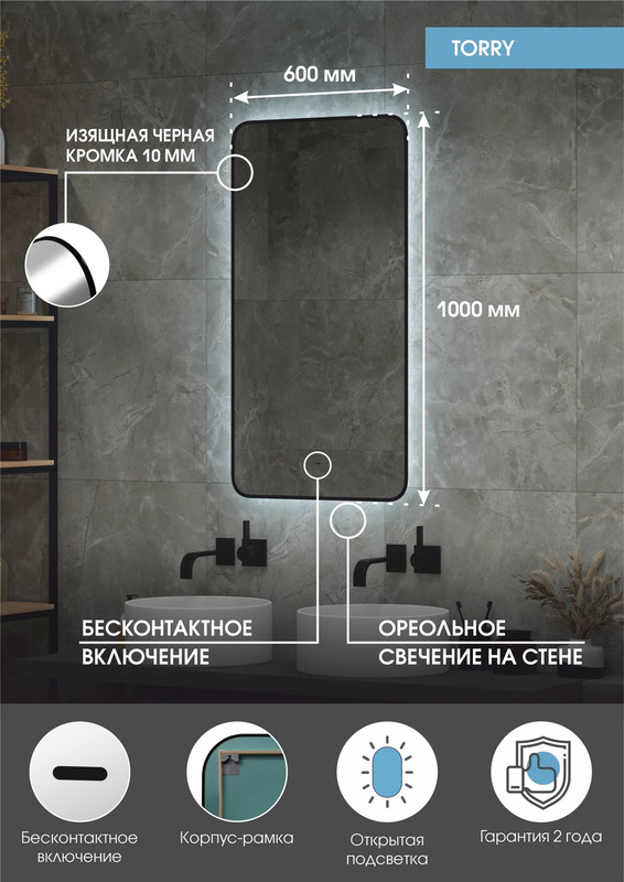 Настенное зеркало нового поколения, изготовленное из полотна толщиной 4 мм от ведущего европейского производителя AGC. При изготовлении используется светодиодная лента с плотностью диодов 120 шт/м и мощностью 9,6 Вт/м, обеспечивающая яркое и равномерное свечение. Для управления подсветкой используется бесконтактный cенсор. Температура ореольной подсветки холодная – 6000К, потребляемая мощность 29 Вт. Срок гарантии – 2 года.