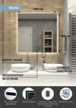 Зеркало с подсветкой “Trezhe Led” 1000х1000 с бесконтактным сенсором, холодная подсветка – это настенное зеркало нового поколения, изготовленное из полотна толщиной 4 мм от ведущего европейского производителя AGC. При изготовлении используется светодиодная лента с плотностью диодов 120 шт/м и мощностью 9,6 Вт/м, обеспечивающая яркое и равномерное свечение. “Trezhe Led” 1000х1000 с бесконтактным сенсором, холодная подсветка – это квадратное зеркало для ванной шириной 100 см, высотой 100 см. Вес зеркала с упаковкой – 12,5 кг. Для управления подсветкой используется бесконтактный cенсор. Температура ореольной подсветки холодная – 6000К, потребляемая мощность 36 Вт. Основа для изделия – корпус из ПВХ рамка белого цвета. Срок гарантии – 2 года.