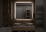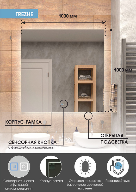 Настенное зеркало нового поколения для ванных комнат Trezhe с бесконтактным сенсором, холодной подсветкой и антизапотеванием, изготовленное из зеркального полотна толщиной 4 мм. При изготовлении используется светодиодная лента с плотностью диодов 120 шт/м и мощностью 9,6 Вт/м, обеспечивающая яркое и равномерное свечение. Основа для изделия – корпус из МДФ-рамки. Срок гарантии – 2 года.