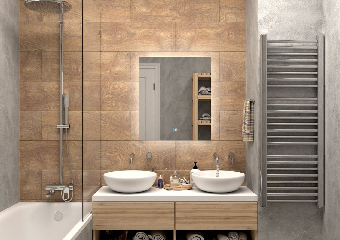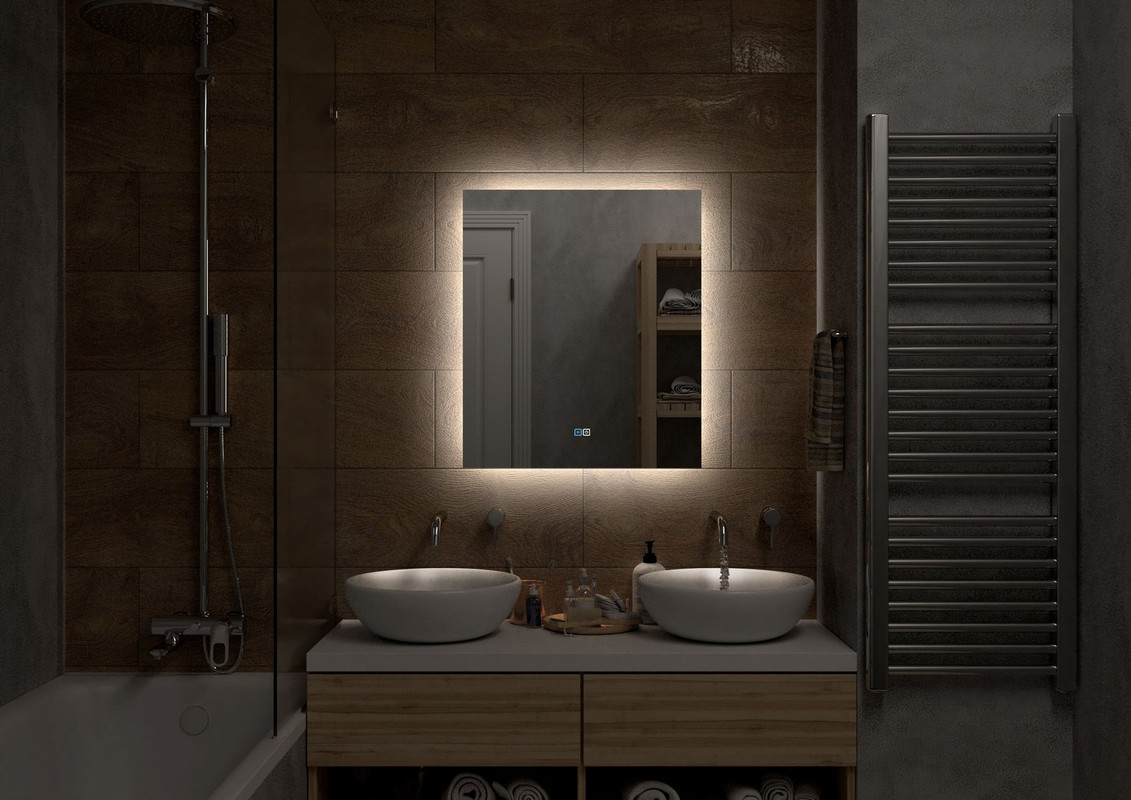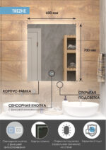 Настенное зеркало нового поколения для ванных комнат Trezhe с бесконтактным сенсором, холодной подсветкой и антизапотеванием, изготовленное из зеркального полотна толщиной 4 мм. При изготовлении используется светодиодная лента с плотностью диодов 120 шт/м и мощностью 9,6 Вт/м, обеспечивающая яркое и равномерное свечение. Основа для изделия – корпус из МДФ-рамки. Срок гарантии – 2 года.