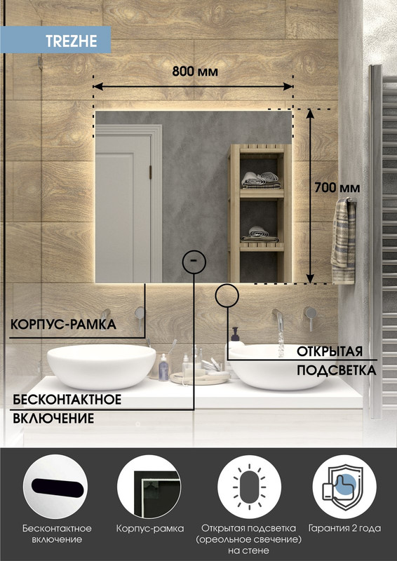 Зеркало с подсветкой “Trezhe Led” 800х700 с бесконтактным сенсором, холодная подсветка – это настенное зеркало нового поколения, изготовленное из полотна толщиной 4 мм от ведущего европейского производителя AGC. При изготовлении используется светодиодная лента с плотностью диодов 120 шт/м и мощностью 9,6 Вт/м, обеспечивающая яркое и равномерное свечение. “Trezhe Led” 800х700 с бесконтактным сенсором, холодная подсветка – это прямоугольное зеркало для ванной шириной 80 см, высотой 70 см. Вес зеркала с упаковкой – 7 кг. Для управления подсветкой используется бесконтактный cенсор. Температура ореольной подсветки холодная – 6000К, потребляемая мощность 27 Вт. Основа для изделия – корпус из ПВХ рамка белого цвета. Срок гарантии – 2 года.