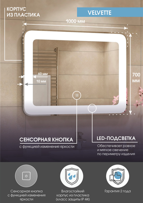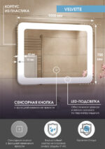 Зеркало с подсветкой “Velvette Led” 1000×700 – это настенное зеркало нового поколения, изготовленное из полотна толщиной 4 мм от ведущего европейского производителя AGC. При изготовлении используется светодиодная лента с плотностью диодов 120 шт/м и мощностью 9,6 Вт/м, обеспечивающая яркое и равномерное свечение. “Velvette Led” 1000×700 – это прямоугольное зеркало для ванной шириной 100 см, высотой 70 см. Вес зеркала с упаковкой – 9 кг. Для управления подсветкой используется cенсор. Температура внутренней подсветки холодная – 6000К, потребляемая мощность 31 Вт. Основа для изделия – корпус из ударопрочного пластика белого цвета. Срок гарантии – 2 года.