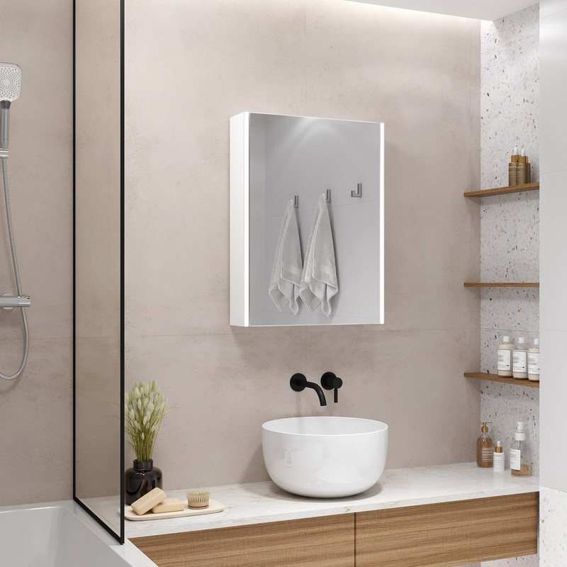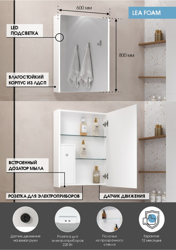 Continent Зеркальный шкаф Lea Foam белый 600х800 правый, датчик движения, диспенсор, алюминиевый профиль, розетка