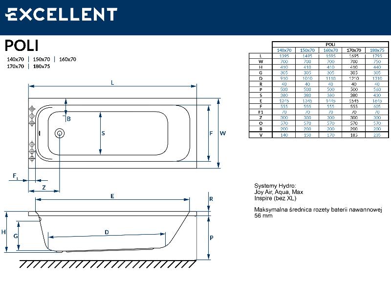 Excellent Poli – классическая акриловая ванна из прочного материала Lucite. Идеальное сочетание эргономики, долговечности и простого ухода.