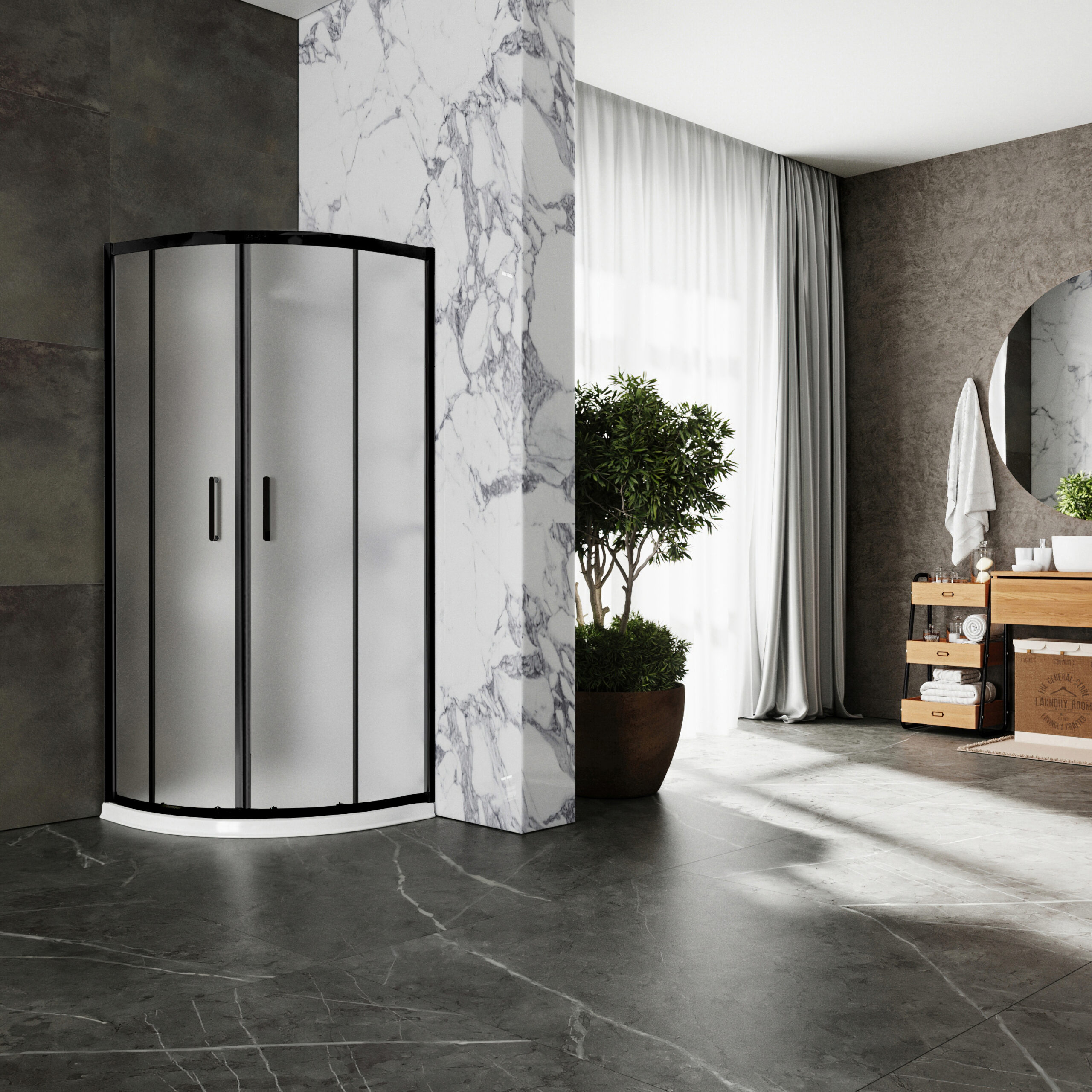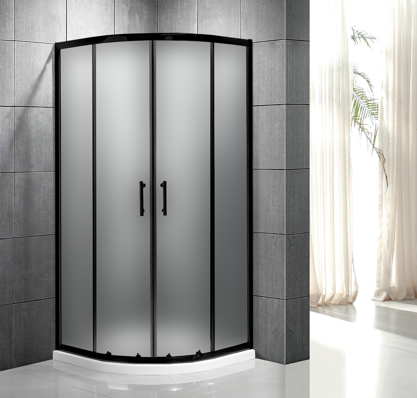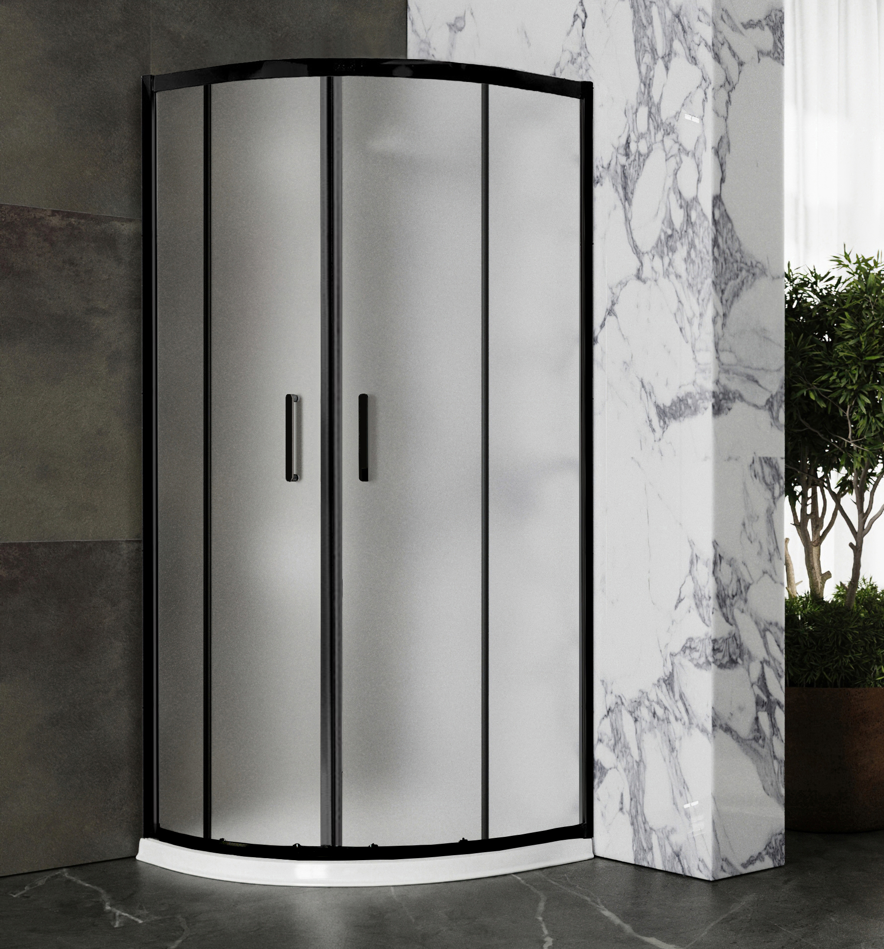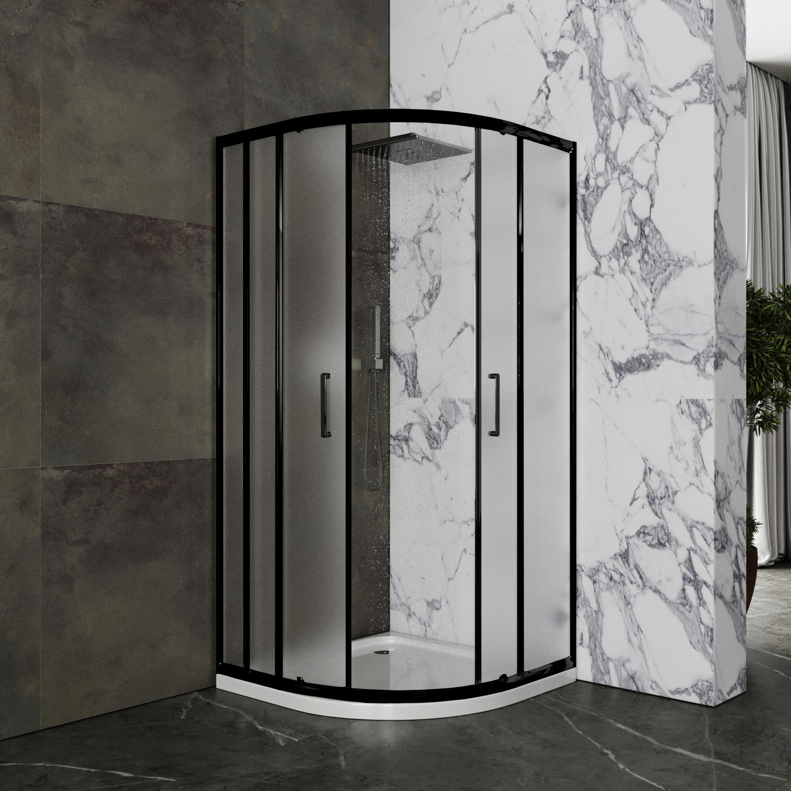 Душевой уголок Roxen Santi с матовыми стеклами и черным матовым профилем – полукруглое душевое ограждение с раздвижными дверями. Матовое стекло не требует сложного ухода, не затемняет пространство внутри уголка и имеет эффектный внешний вид. Прочный профиль изготовлен из анодированного термостойкого алюминия со специальным покрытием DeepBlack, которое на долгие годы сохраняет насыщенный цвет изделия, предотвращает образование коррозии защищает от царапин. Герметичность уголка обеспечивают специальные силиконовые уплотнители. Удобные двойные ручки изготовлены из стали. Двойные металлические ролики на подшипниках обеспечивают мягкий ход, бесшумность и долгий срок службы. Ролики имеют специальные накладки, которые не только защищают от попадания лишней влаги и мелкого мусора, но и придают эстетичный вид. Так же все ролики оснащены специальными кнопками, нажатием которых вы можете отодвинуть створку и произвести уборку малодоступных частей кабины. Конструкция роликов и пазов, по которым они двигаются, предотвращает перекос и заедание подвижных частей уголка. Cпециальная технология EasyFix обеспечивает быстрый и надежный монтаж алюминиевых профилей изделия. Уголок имеет универсальную установку – на пол, оборудованный сливным трапом, душевой поддон или подиум.