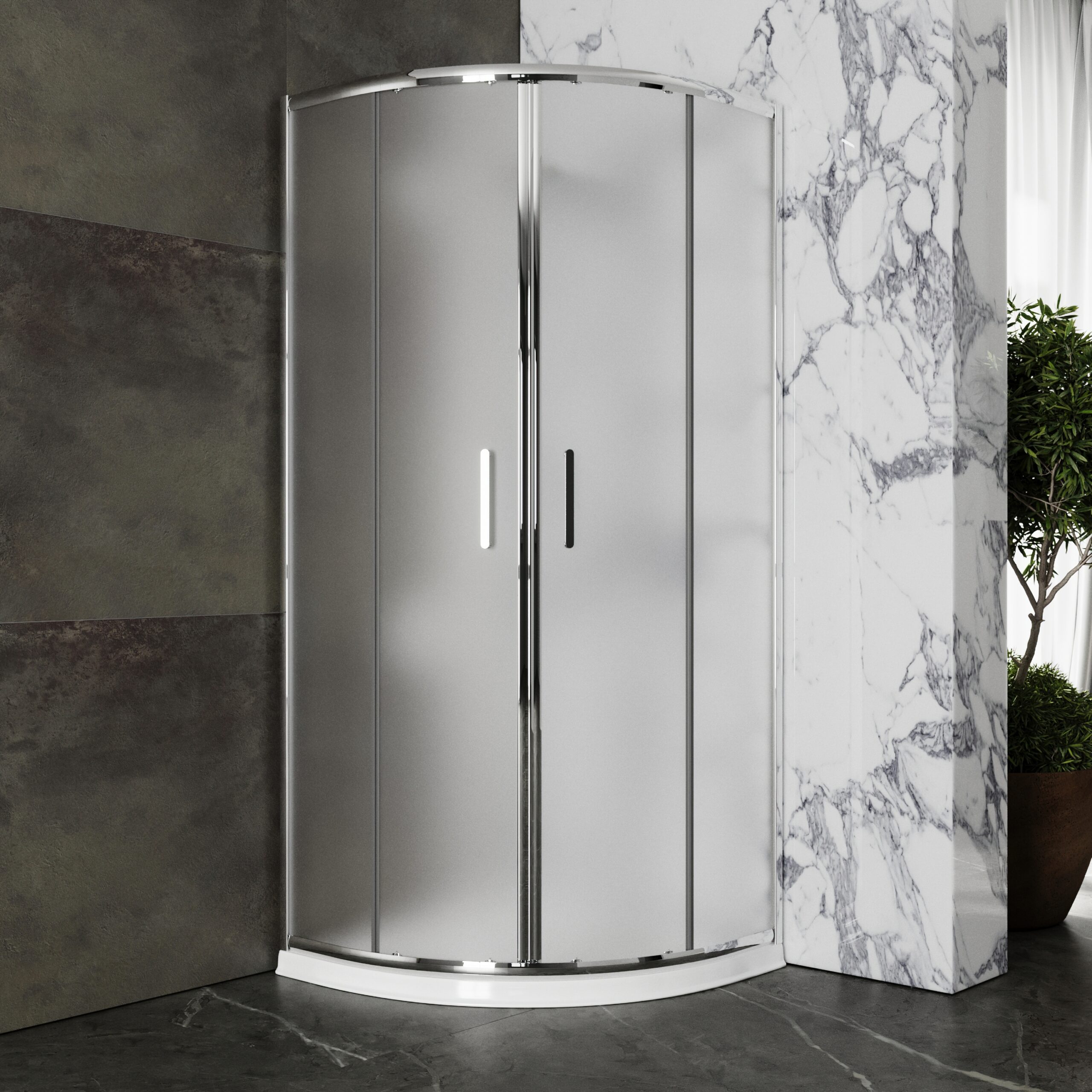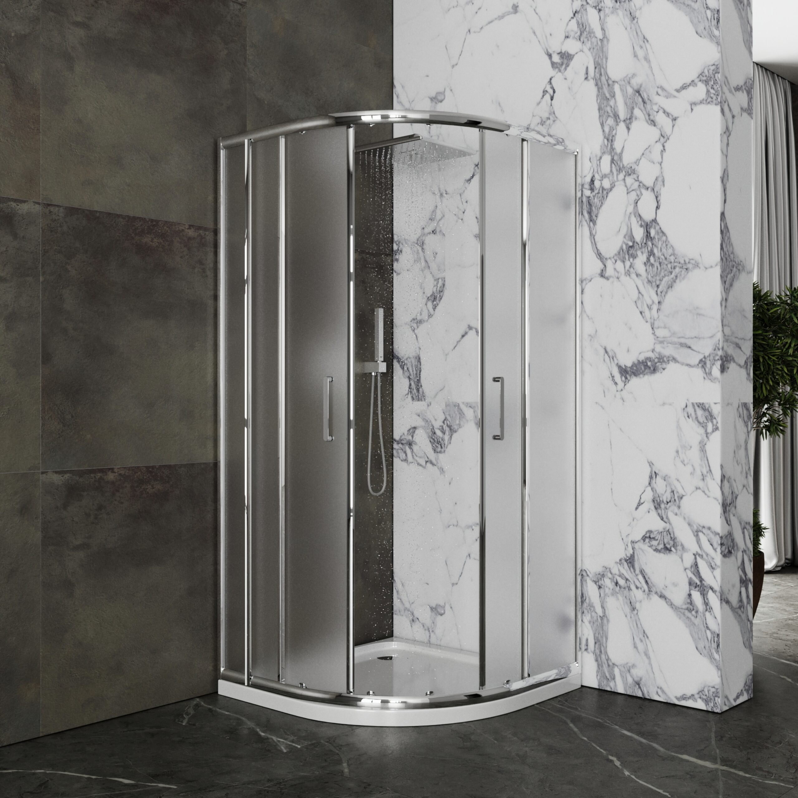 Душевой уголок Roxen Santi с матовыми стеклами – полукруглое душевое ограждение с раздвижными дверями. Матовое стекло не требует сложного ухода, не затемняет пространство внутри уголка и имеет эффектный внешний вид. Прочный профиль изготовлен из анодированного термостойкого алюминия со специальным покрытием UltraShine, которое на долгие годы сохраняет блеск изделия, предотвращает образование коррозии защищает от царапин. Герметичность изделия обеспечивают специальные силиконовые уплотнители. Удобные двойные ручки изготовлены из хромированной стали. Двойные металлические ролики на подшипниках обеспечивают мягкий ход, бесшумность и долгий срок службы. Ролики имеют хромированные накладки, которые не только защищают от попадания лишней влаги и мелкого мусора, но и придают эстетичный вид. Так же все ролики оснащены специальными кнопками, нажатием которых вы можете отодвинуть створку и произвести уборку малодоступных частей кабины. Конструкция роликов и пазов, по которым они двигаются, предотвращает перекос и заедание подвижных частей уголка. Cпециальная технология EasyFix обеспечивает быстрый и надежный монтаж алюминиевых профилей изделия. Уголок имеет универсальную установку – на пол, оборудованный сливным трапом, душевой поддон или подиум.