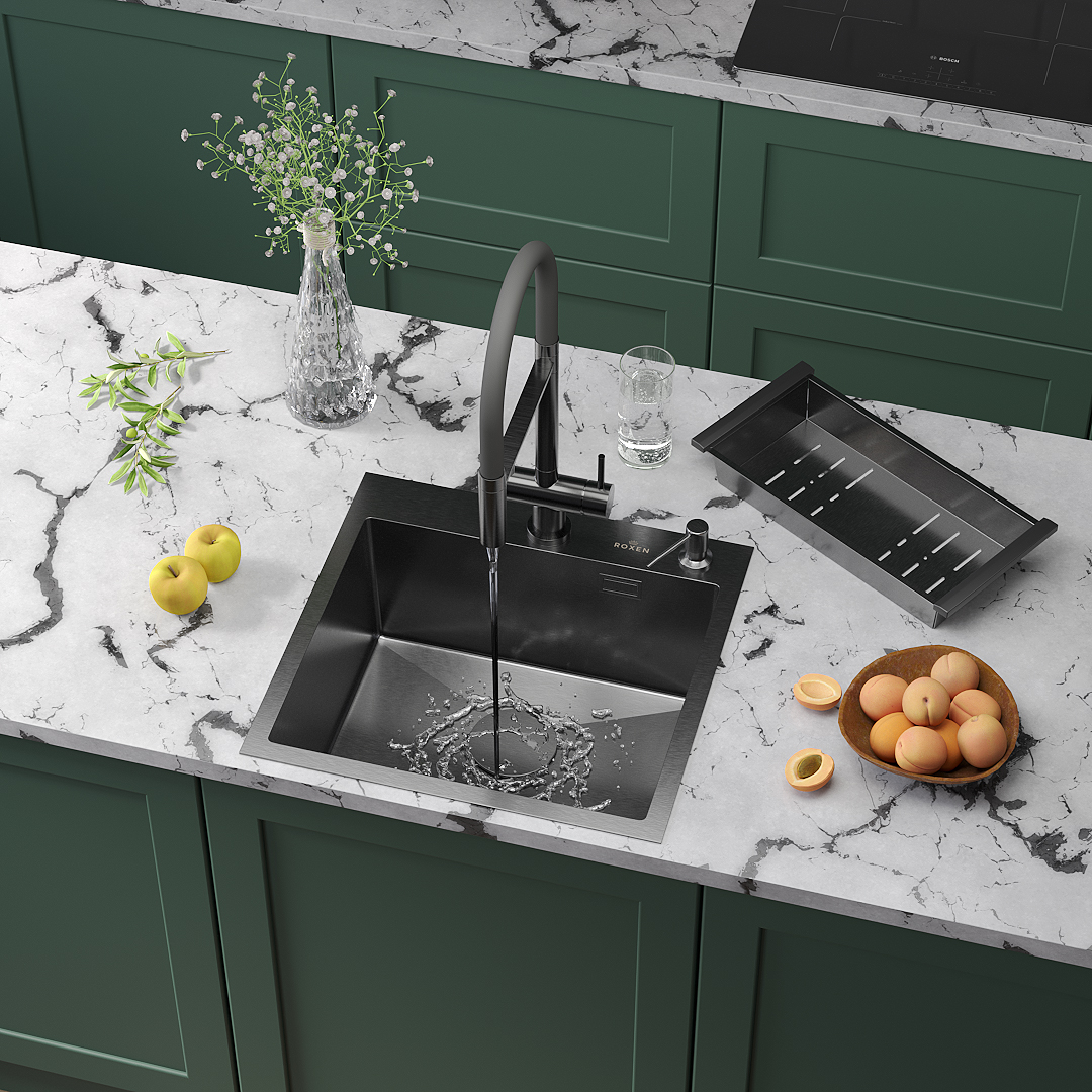 Кухонная мойка Roxen Simple 50 PVD (графит) с коландером и дозатором в комплекте. Удобная модель в цвете графит, с глубокой чашей и квадратным отверстием слива, сочетает в себе стильный современный дизайн и отличные эксплуатационные характеристики. Мойка изготовлена из аустенитной низкоуглеродистой стали марки AISI 304, которая обладает устойчивостью к коррозии, окислению и перепаду температур. Отличные шумопоглощающие характеристики мойки обеспечиваются шумоподавляющим составом Silent Protection и шумопоглощающими пластинами Soft Silence, которые располагаются по всей чаше мойки.