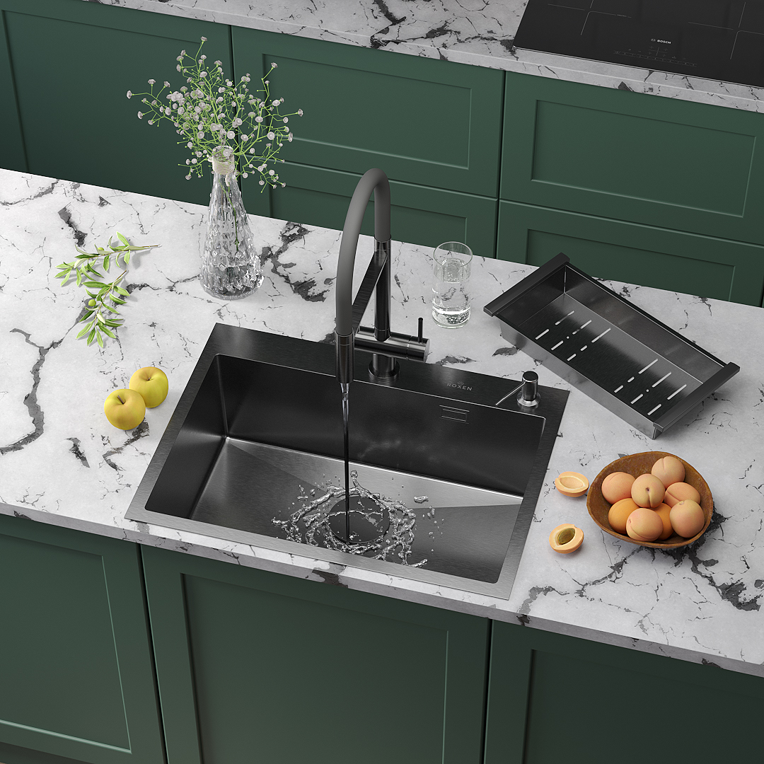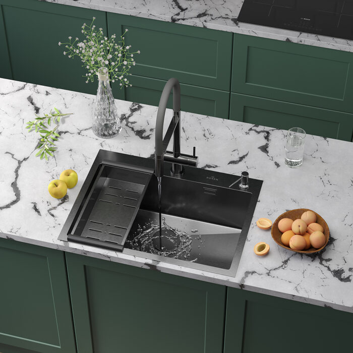 Кухонная мойка Roxen Simple 65 PVD (графит) 65х48 с коландером и дозатором в комплекте. Удобная прямоугольная модель в цвете графит, с большой глубокой чашей, сочетает в себе стильный современный дизайн и отличные эксплуатационные характеристики. Мойка изготовлена из аустенитной низкоуглеродистой стали марки AISI 304, которая обладает устойчивостью к коррозии, окислению и перепаду температур. Отличные шумопоглощающие характеристики мойки обеспечиваются шумоподавляющим составом Silent Protection и шумопоглощающими пластинами Soft Silence, которые располагаются по всей чаше мойки.