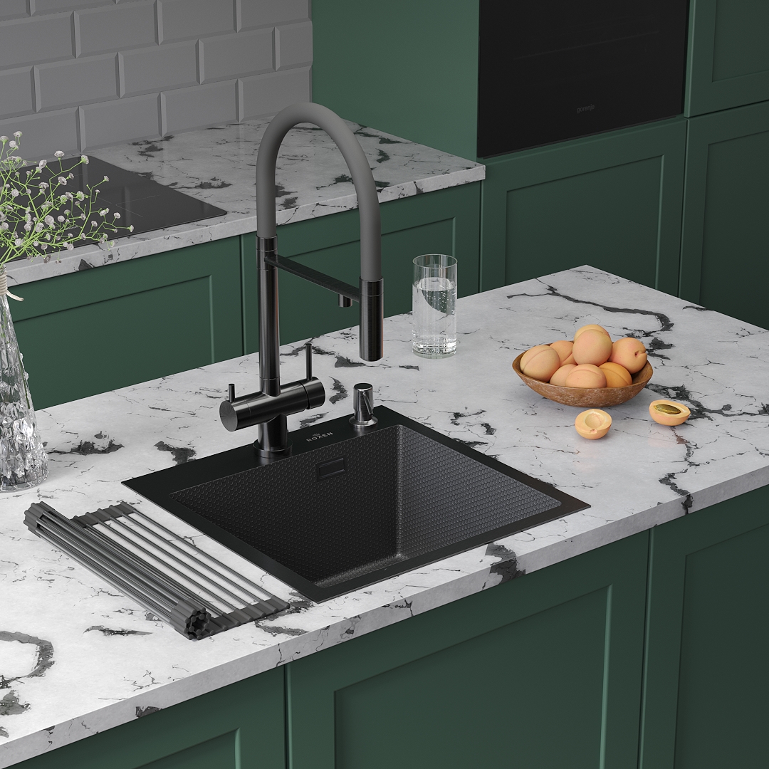 Кухонная мойка Roxen Snake 45 PVD графит с ролл-матом и дозатором в комплекте (текстурное покрытие). Современная вместительная модель премиального сегмента с глубокой чашей и широким отверстием слива, сочетает в себе стильный современный дизайн и отличные эксплуатационные характеристики. Мойка изготовлена из аустенитной низкоуглеродистой стали марки AISI 304, которая обладает устойчивостью к коррозии, окислению и перепаду температур. Толщина стали исключает деформацию и обеспечивает долгий срок эксплуатации. Отличные шумопоглощающие характеристики мойки обеспечиваются шумоподавляющим составом Silent Protection и шумопоглощающими пластинами Soft Silence, которые располагаются по всей чаше мойки.