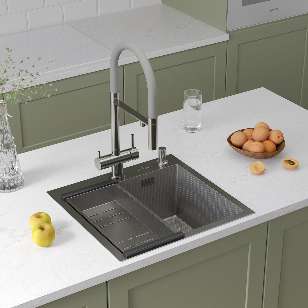 Кухонная мойка Roxen Snake 50 PVD графит с коландером и дозатором в комплекте (текстурное покрытие). Современная вместительная модель премиального сегмента