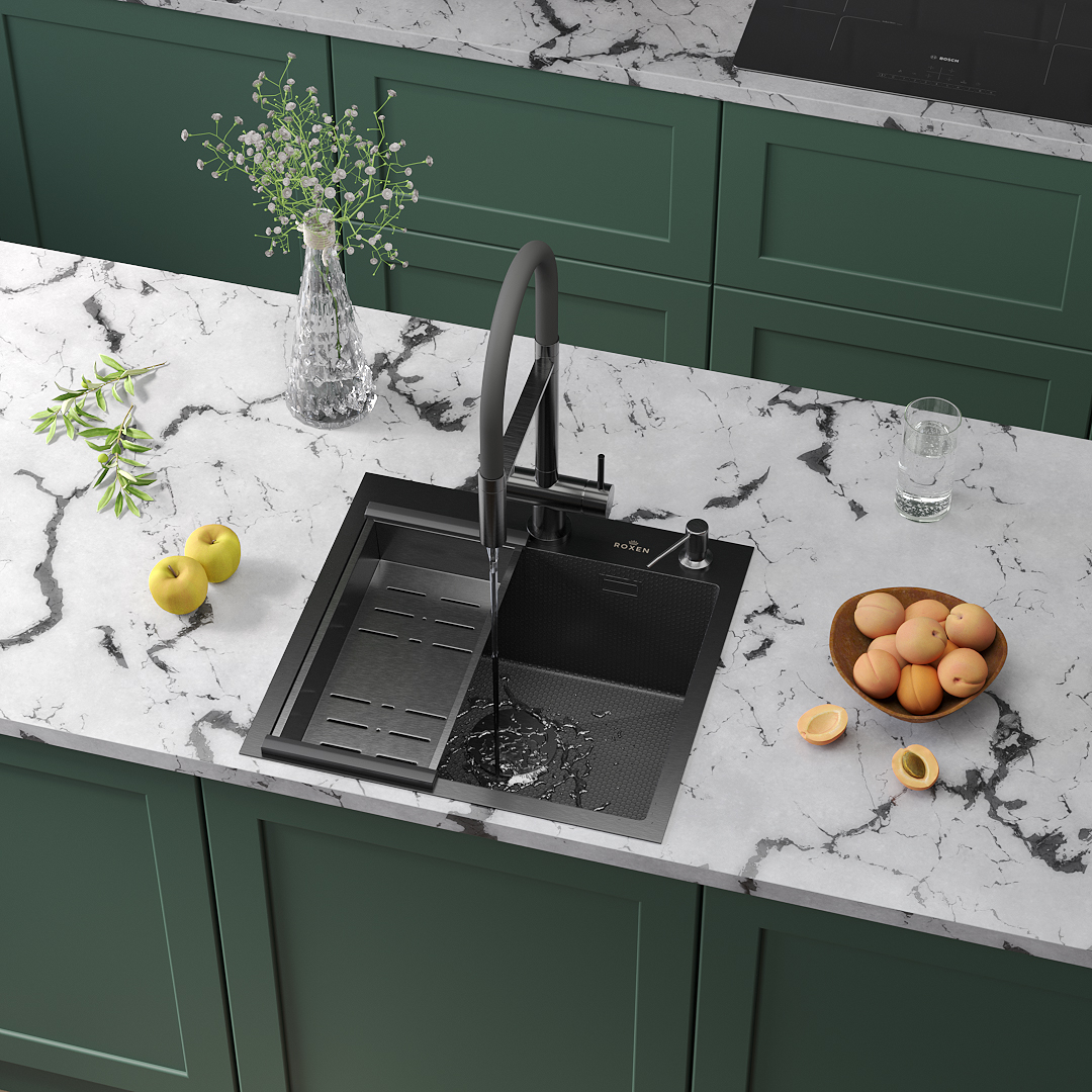 Кухонная мойка Roxen Simple 45 PVD (графит) с ролл-матом и дозатором в комплекте. Удобная модель в цвете графит, с глубокой
