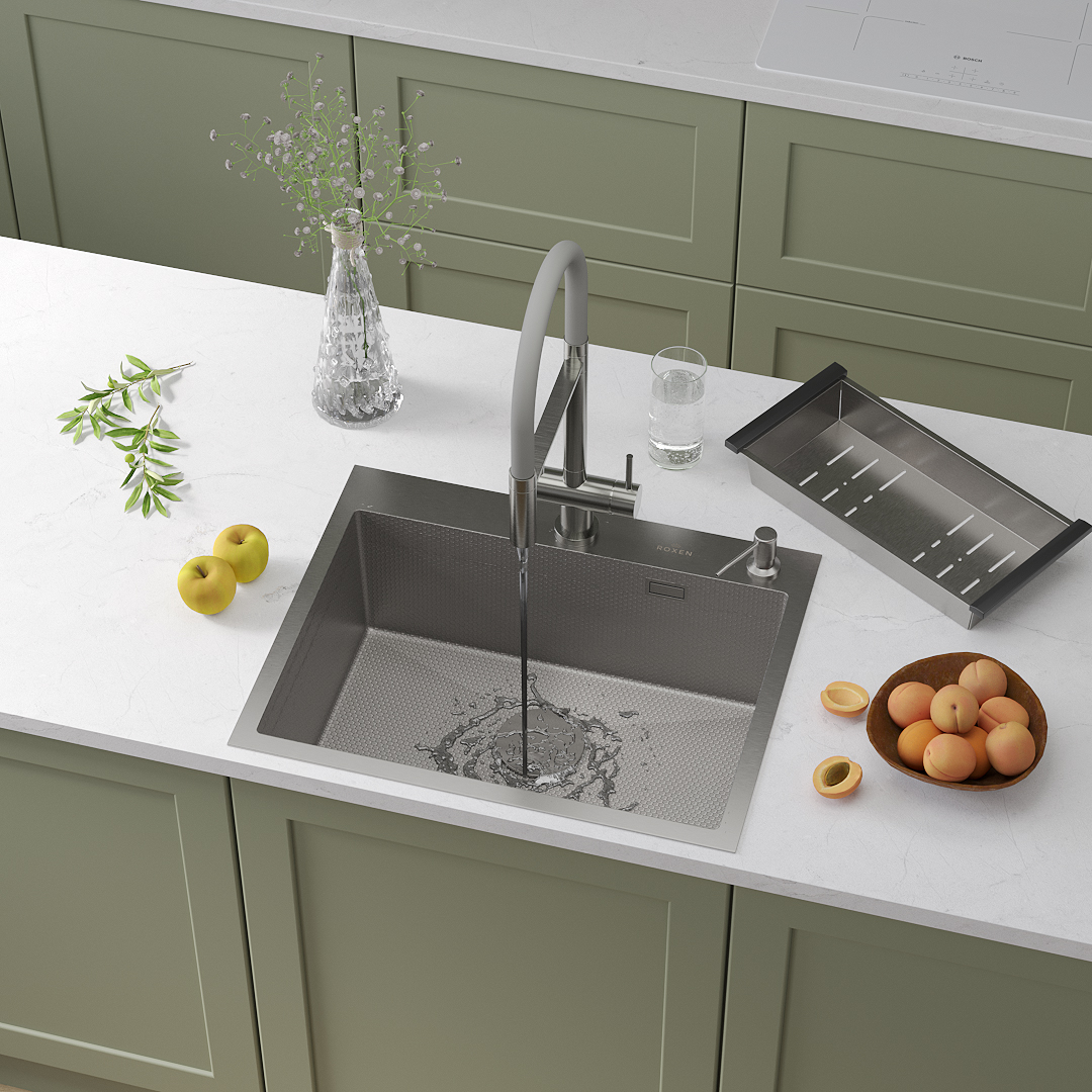 Кухонная мойка Roxen Snake 60х48 (текстурное покрытие) с коландером и дозатором в комплекте. Современная вместительная модель премиального сегмента с глубокой чашей и широким отверстием слива, сочетает в себе стильный современный дизайн и отличные эксплуатационные характеристики. Мойка изготовлена из аустенитной низкоуглеродистой стали марки AISI 304, которая обладает устойчивостью к коррозии, окислению и перепаду температур. Толщина стали исключает деформацию и обеспечивает долгий срок эксплуатации. Уникальное покрытие Bruch Tech является защитным слоем, устойчивым к истиранию, появлению царапин и механических повреждений. Отличные шумопоглощающие характеристики мойки обеспечиваются шумоподавляющим составом Silent Protection и шумопоглощающими пластинами Soft Silence, которые располагаются по всей чаше мойки.