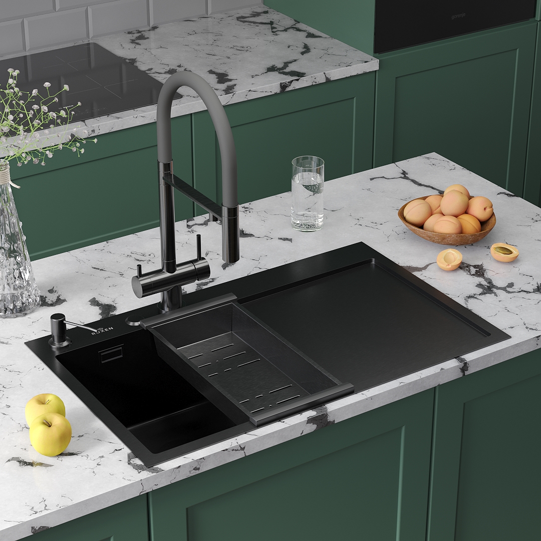 ROXEN Кухонная мойка Simple 55 PVD (графит) с коландером и дозатором графит 560220-55B